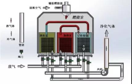 RTO把有機廢氣加熱到760攝氏度以上,使廢氣中的VOCs在氧化分解成二氧化碳和水。氧化產(chǎn)生的高溫氣體流經(jīng)特制的陶瓷蓄熱體,使陶瓷體升溫而“蓄熱”,此“蓄熱”用于預(yù)熱后續(xù)進(jìn)入的有機廢氣,從而節(jié)省廢氣升溫的燃料消耗。陶瓷蓄熱體應(yīng)分成三個(含三個)以上的區(qū)或室,每個蓄熱室依次經(jīng)歷蓄熱-放熱-清掃等程序,周而復(fù)始,連續(xù)工作。蓄熱室“放熱”后應(yīng)立即引入部分已處理合格的潔凈排氣對該蓄熱室進(jìn)行清掃(以保證VOC去除率在99%以上),只有待清掃完成后才能進(jìn)入“蓄熱”程序。RTO蓄熱式廢氣處理設(shè)備,運行費用省,有機廢氣的處理效率高的優(yōu)點,適應(yīng)廢氣濃度1000~10000mg/m3,分解效率:99%—99.5%。是目前較為經(jīng)濟可靠的達(dá)到50mg/m3嚴(yán)格的排放標(biāo)準(zhǔn)的VOCs治理技術(shù),得到了廣泛的應(yīng)用。