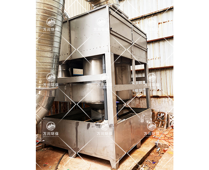 噴淋塔是一種效率高、壓力損失較低的除塵設備。廢氣正面切向進入至內部的噴淋層,通過水洗、噴淋、過濾后漆霧(在循環(huán)水中加入漆霧絮凝劑,使得油性漆霧在水中的溶解性更大)。